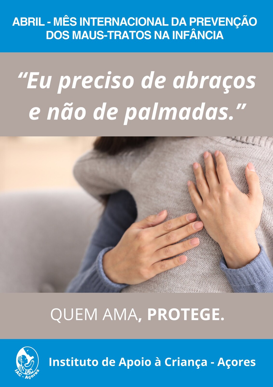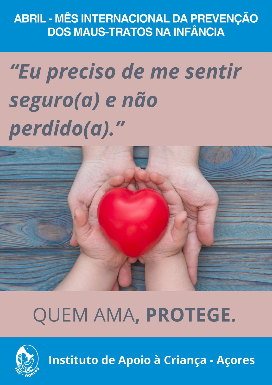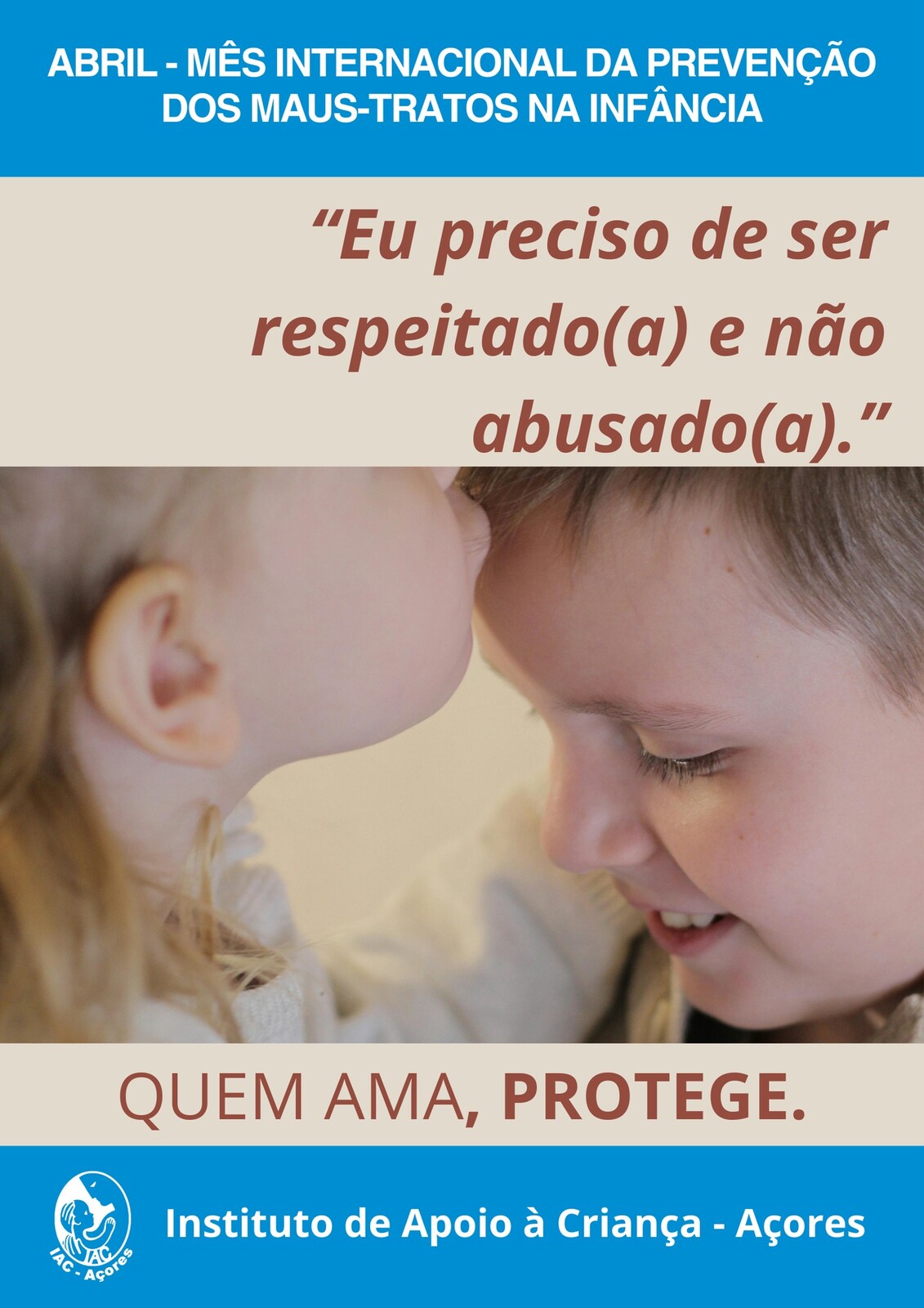 Neste âmbito, o IAC-Açores lança a sua II edição da campanha “Quem Ama, Protege”, que decorrerá ao longo do mês de abril, Mês Internacional da Prevenção dos Maus-Tratos na Infância, com a finalidade de sensibilizar os indivíduos, em particular, e a comunidade, em geral, para a importância de todas as crianças e jovens crescerem em ambientes seguros, protetores e afetuosos, livres de maus-tratos.