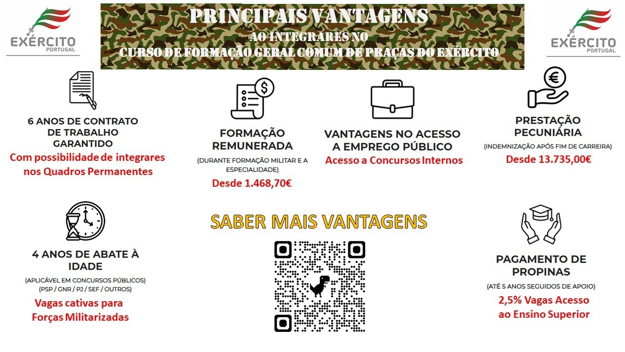 O Exército Português oferece contrato de trabalho, formação remunerada, possibilidade de progressão na carreira com entrada para os quadros permanentes, entre muitas outras vantagens.